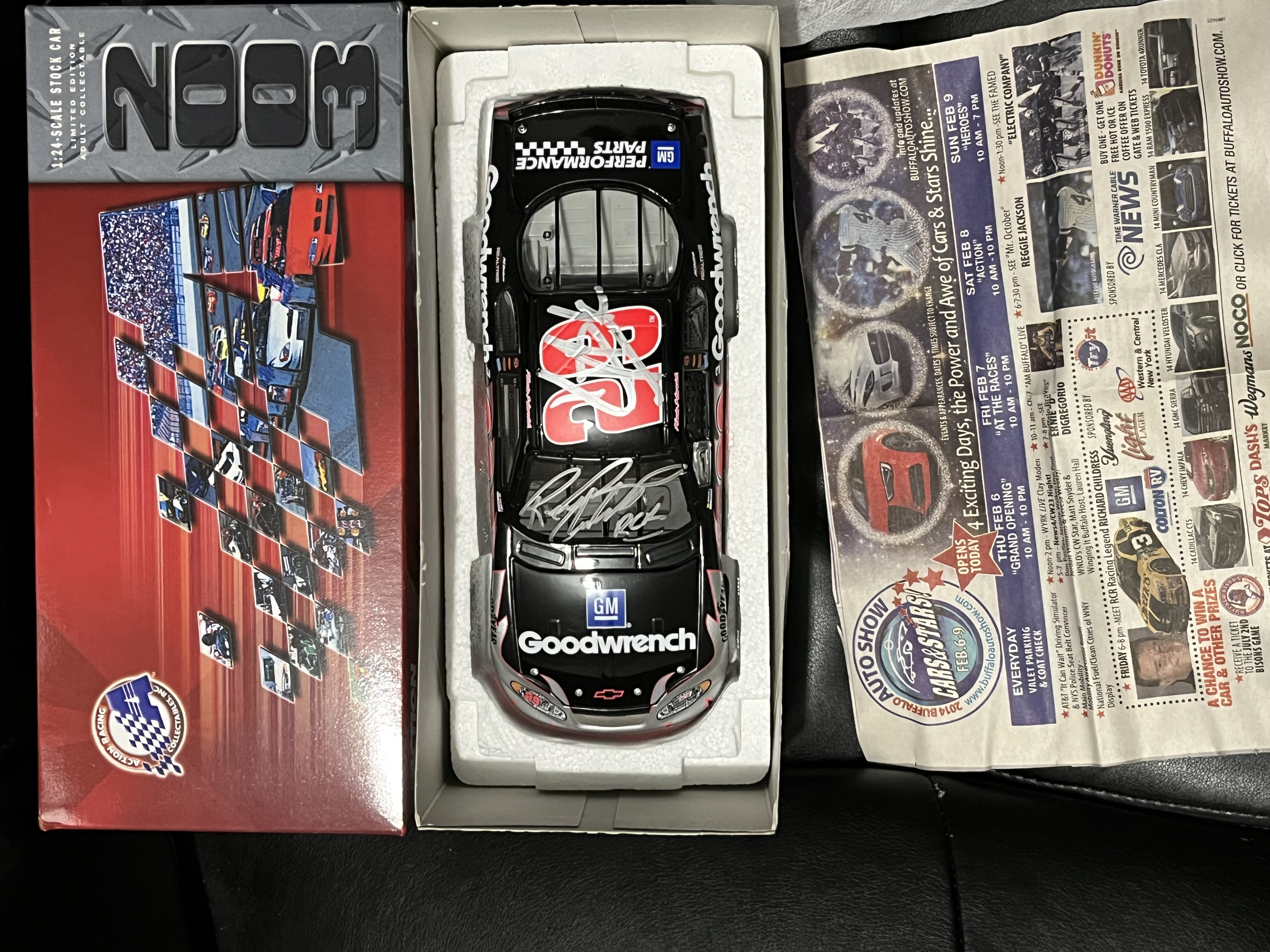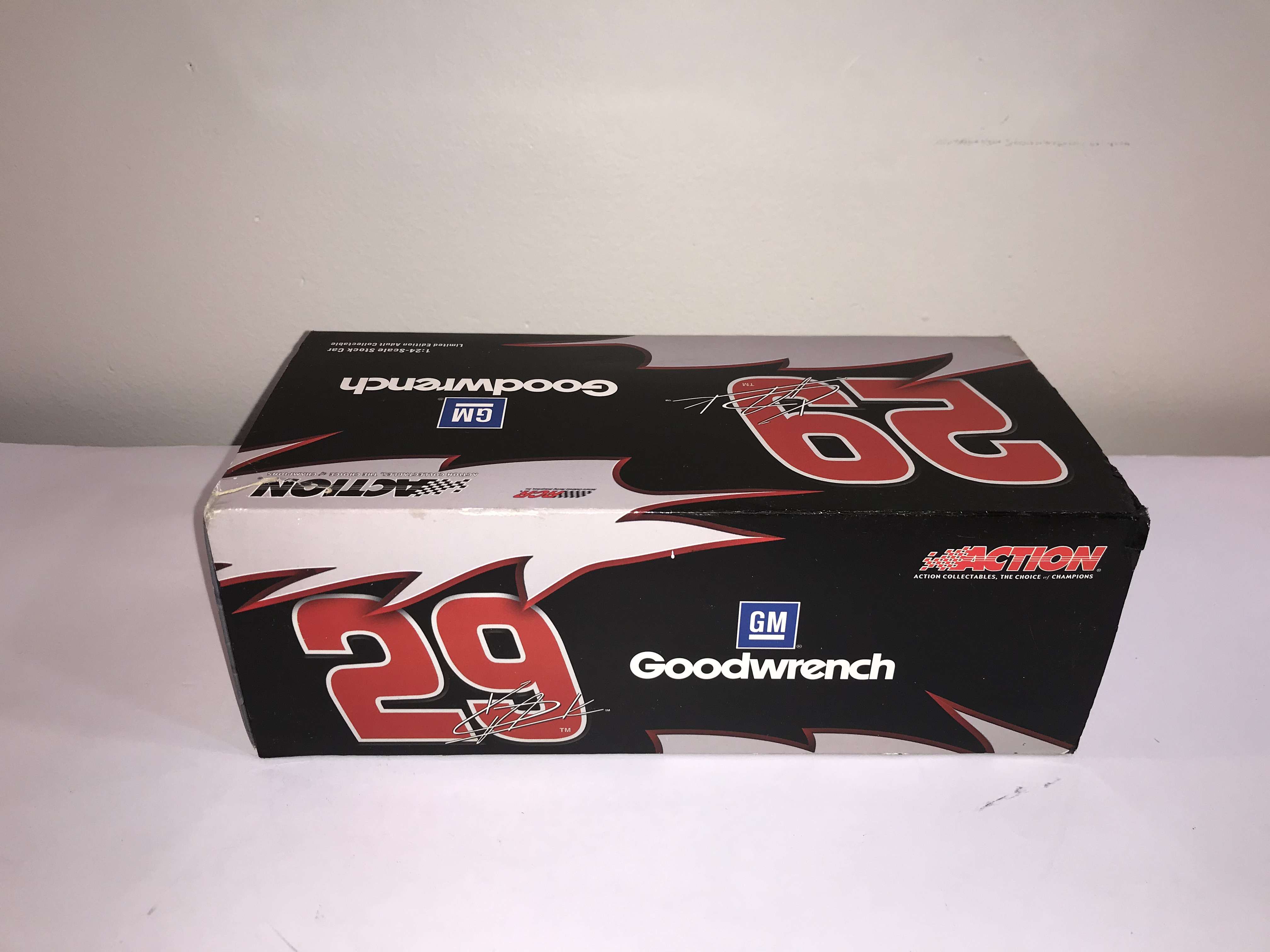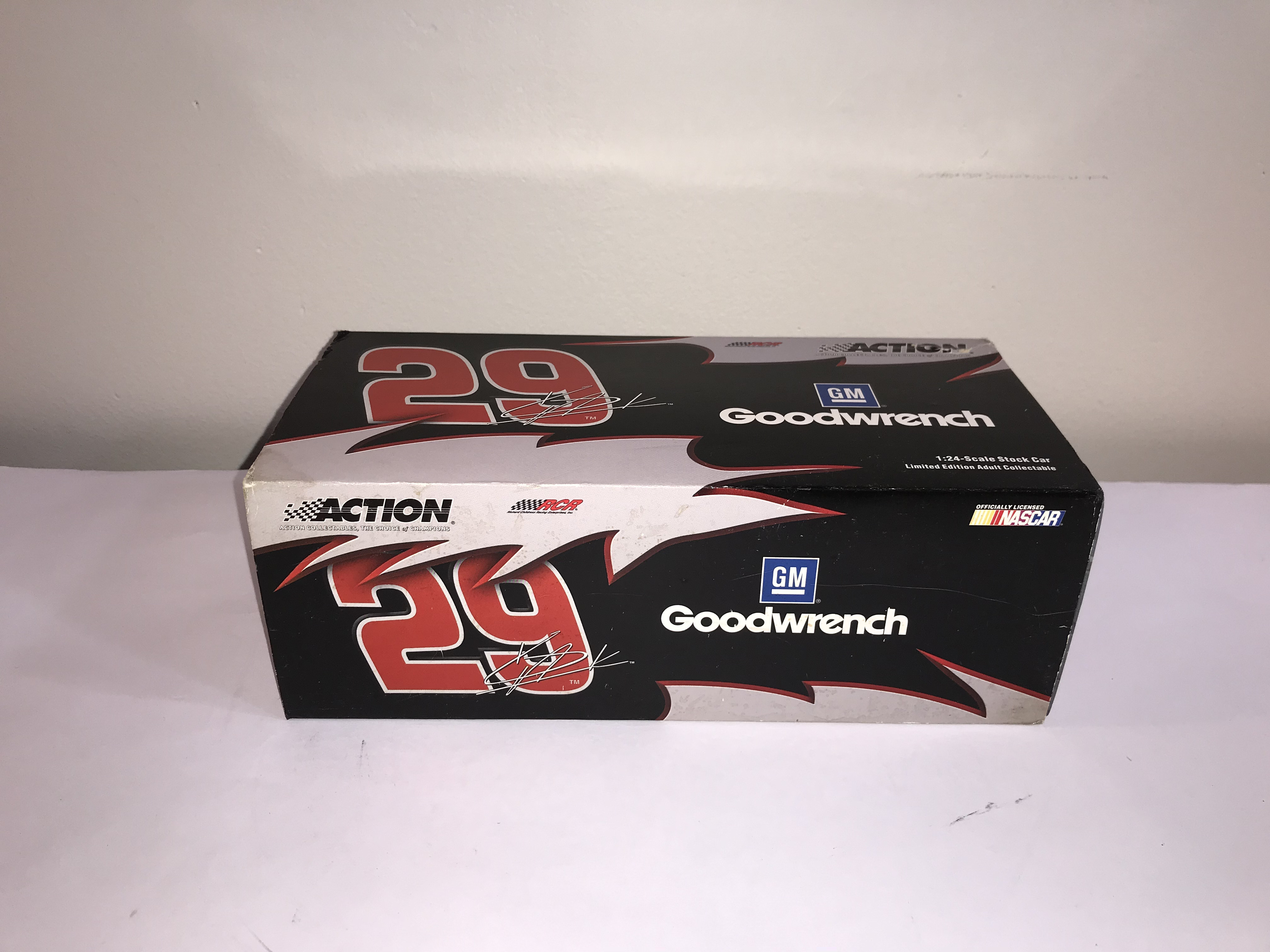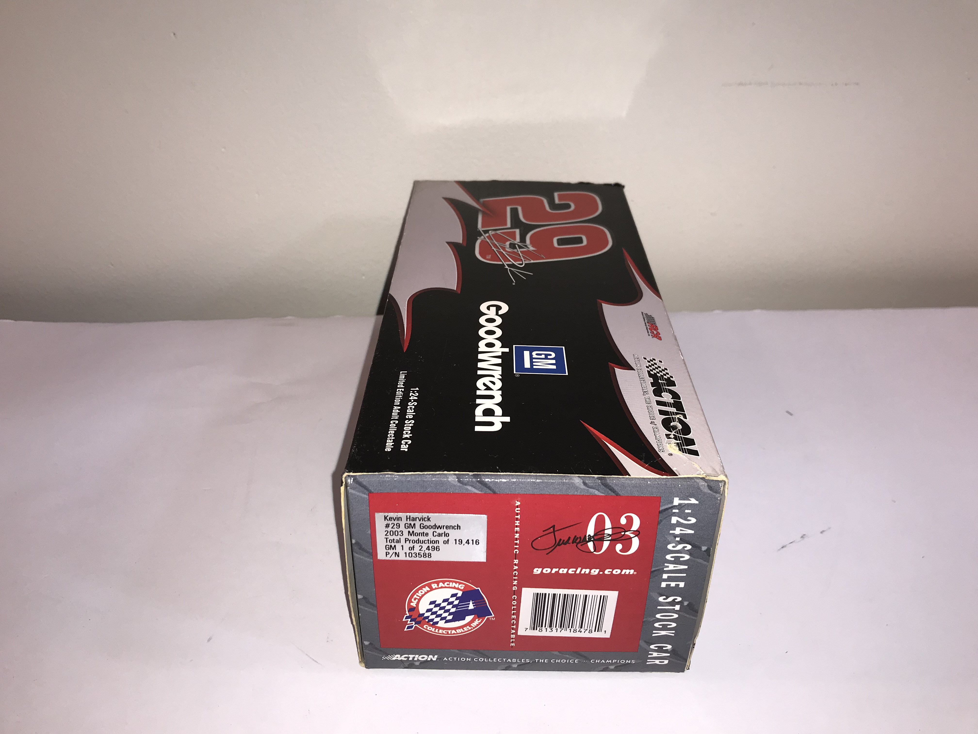 Action Racing Collectables 1:24 scale die-cast replica of the #29 GM Goodwrench Chevrolet Monte Carlo driven by Kevin Harvick for Richard Childress Racing during the 2003 NASCAR season. This item is a limited edition release, specifically identified on the manufacturer label as a GM Dealers edition, with a production run of 2,496 units out of a total production of 19,416. Has 2 signatures: 1 on windshield and 1 on roof of the car. Includes a newspaper clipping of drivers appearance which is where it is believed that 1 or both signatures came from.