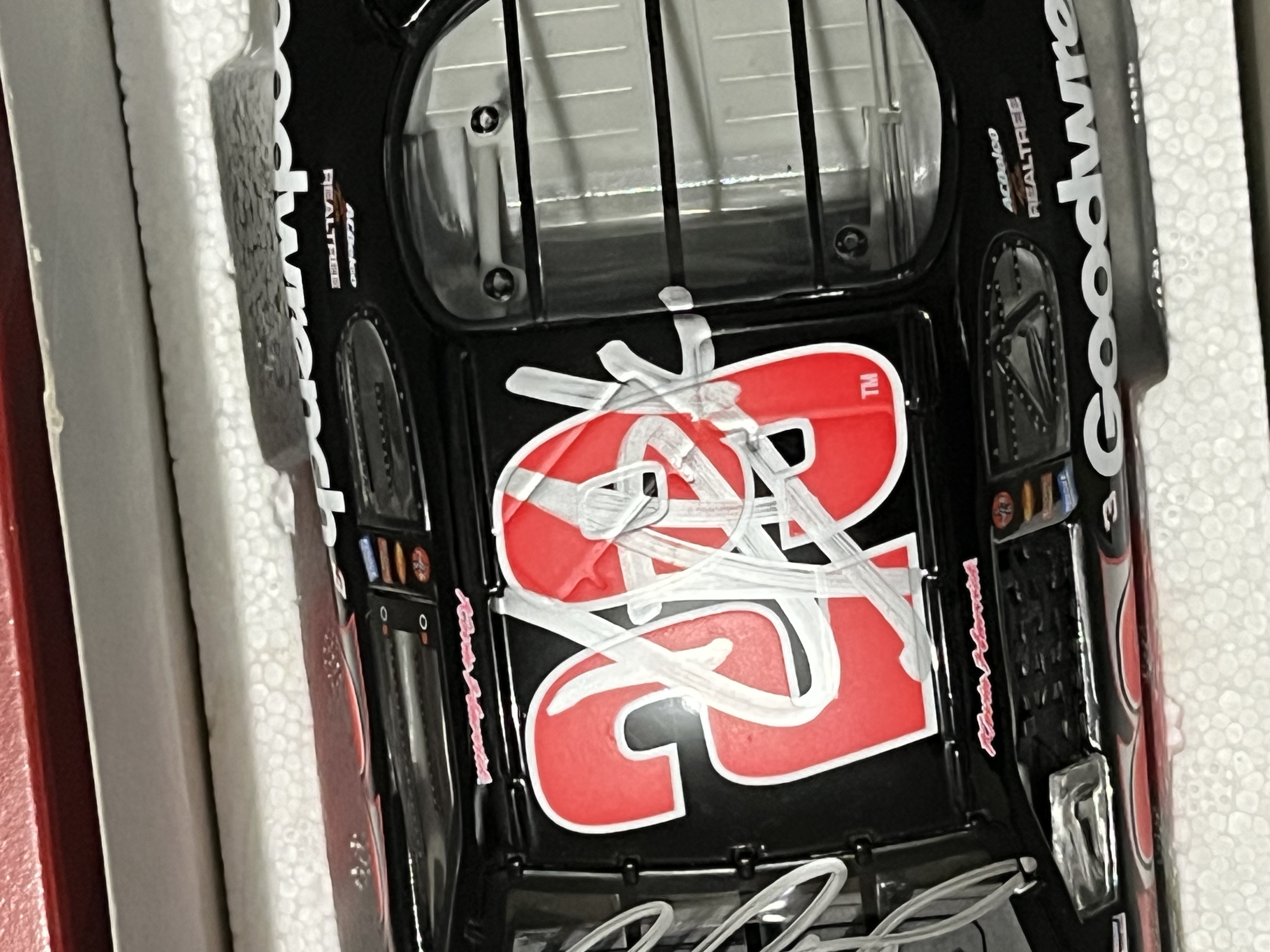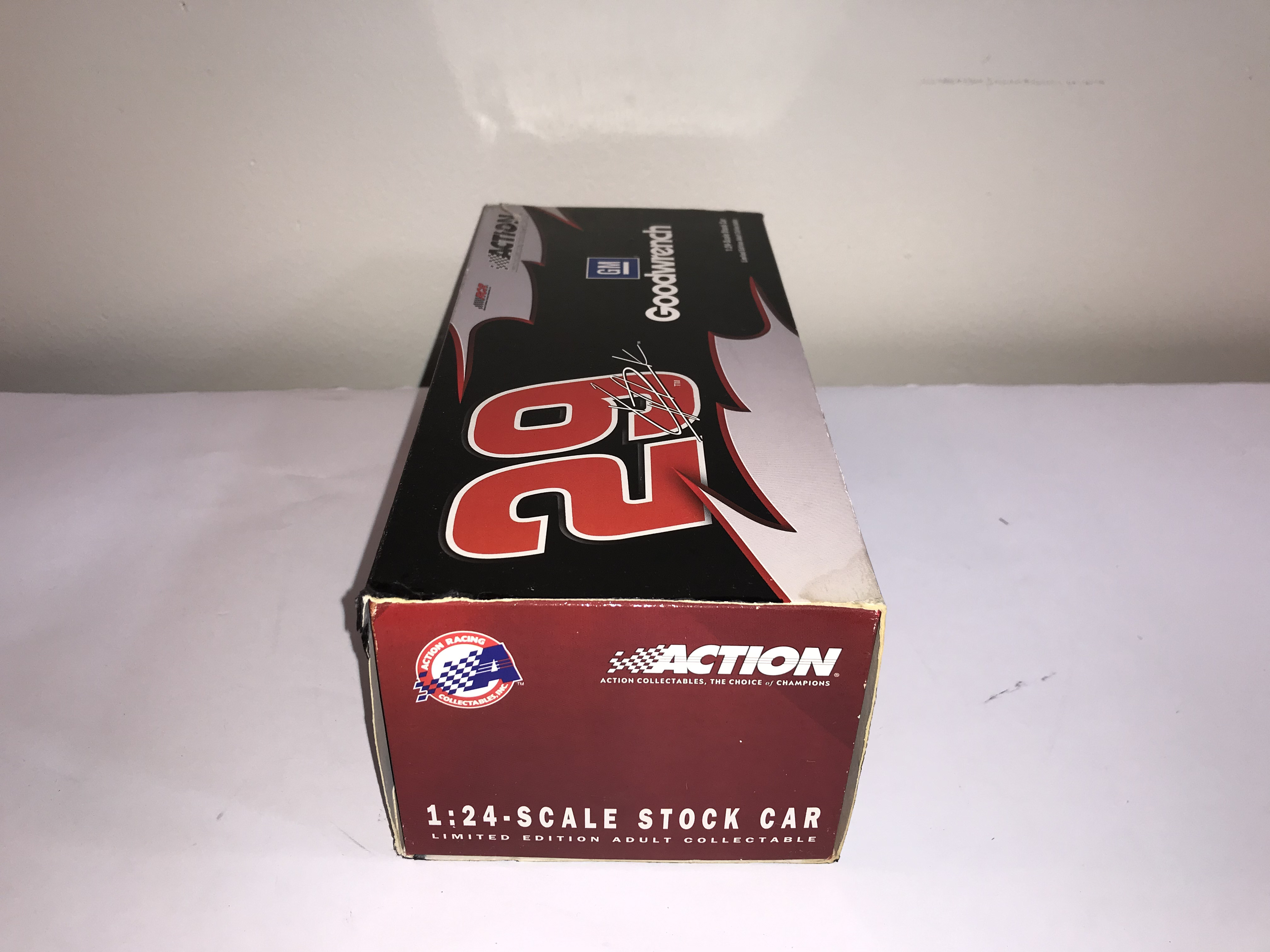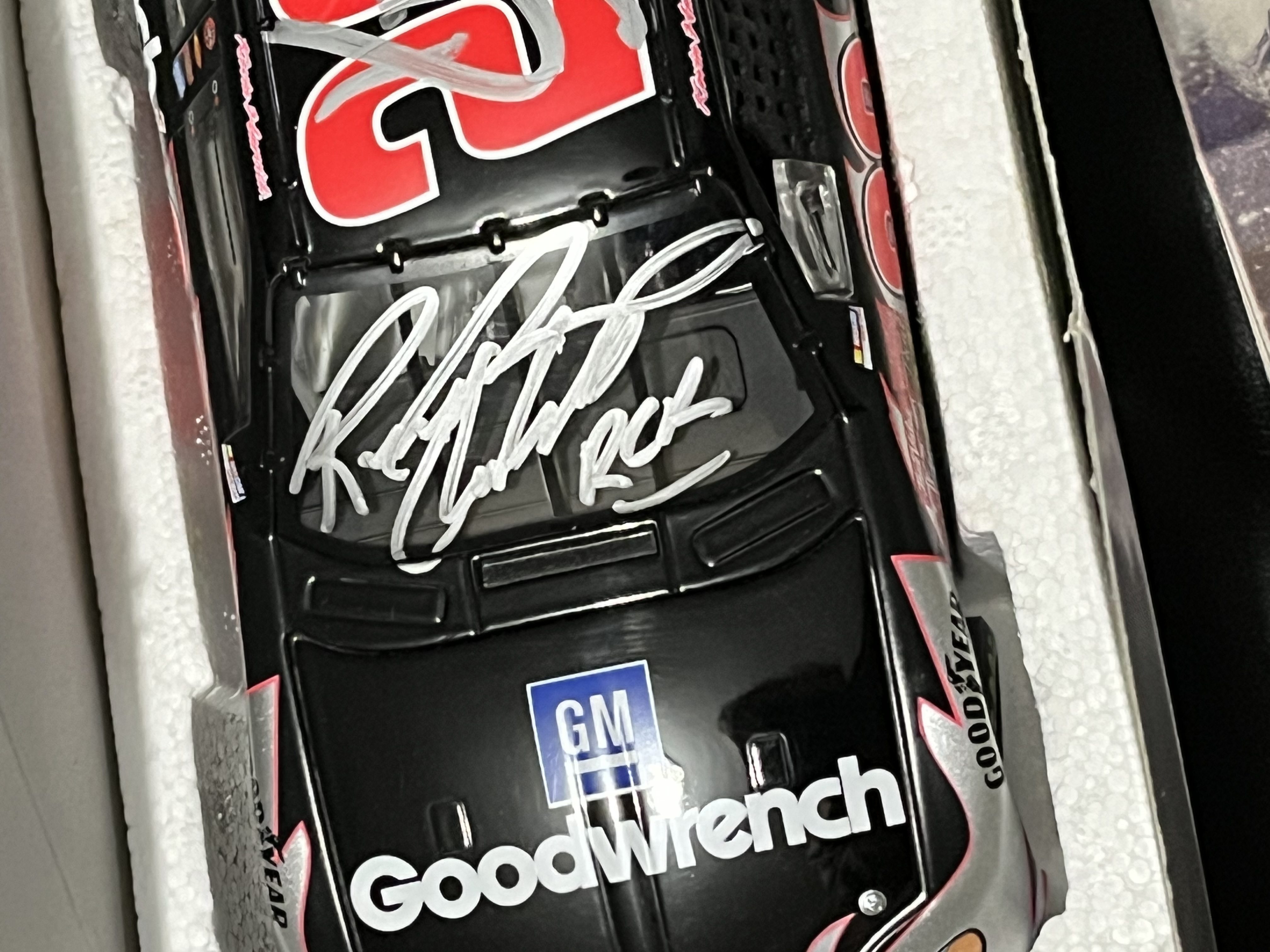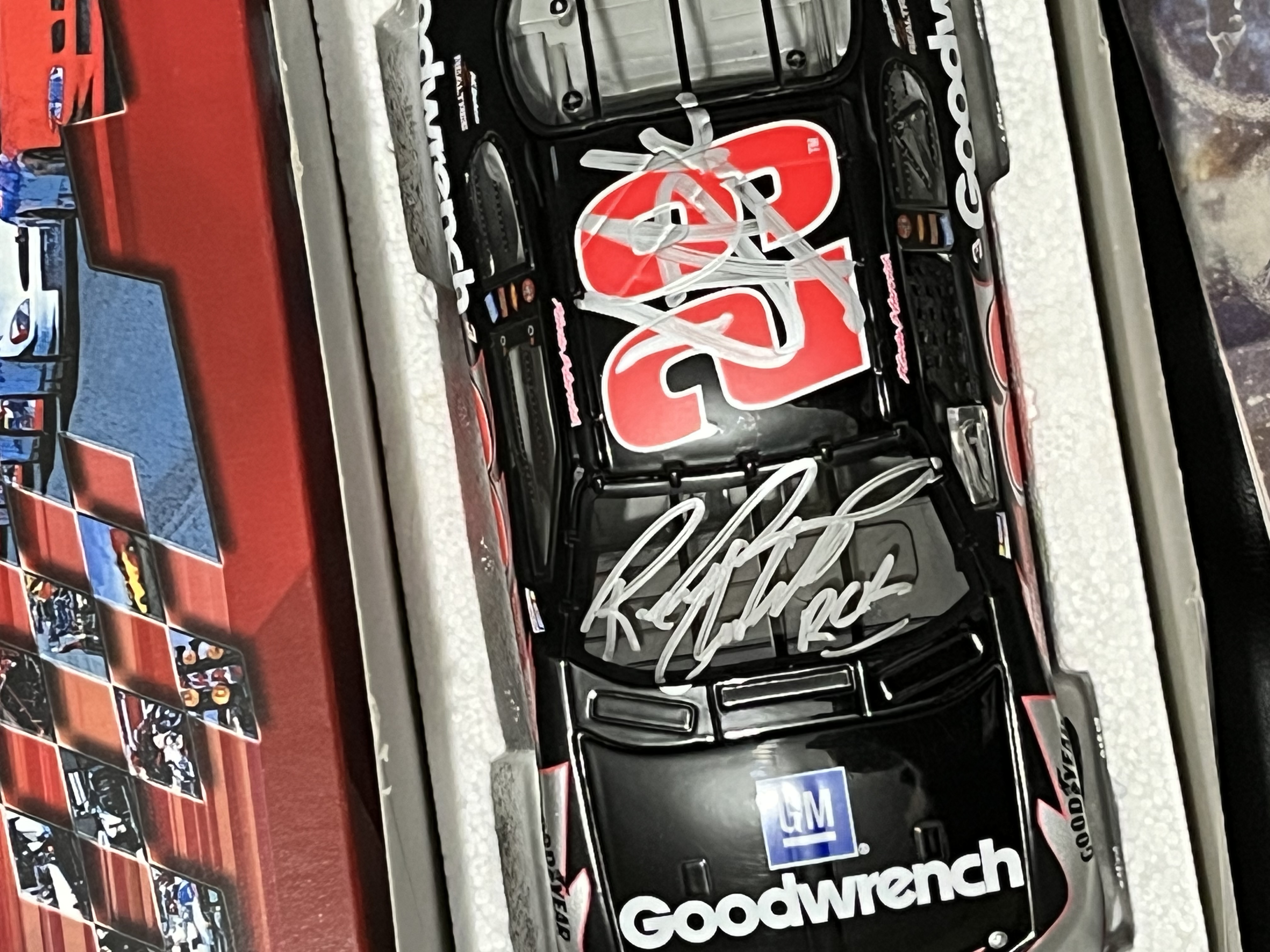 Action Racing Collectables 1:24 scale die-cast replica of the #29 GM Goodwrench Chevrolet Monte Carlo driven by Kevin Harvick for Richard Childress Racing during the 2003 NASCAR season. This item is a limited edition release, specifically identified on the manufacturer label as a GM Dealers edition, with a production run of 2,496 units out of a total production of 19,416. Has 2 signatures: 1 on windshield and 1 on roof of the car. Includes a newspaper clipping of drivers appearance which is where it is believed that 1 or both signatures came from.